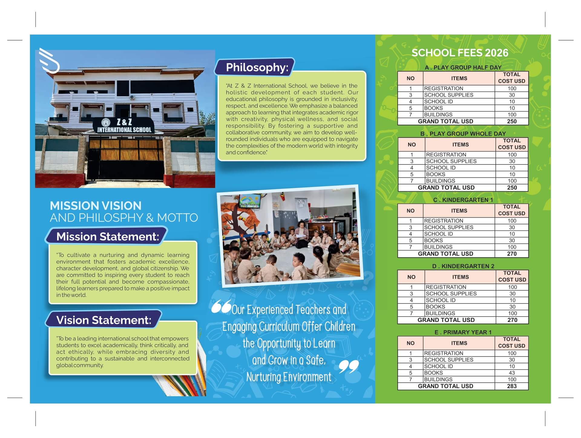 Z&Z International School is committed to providing high-quality education designed for young learners. With programs ranging from Playgroup and Preschool to Primary, we focus on nurturing curiosity, creativity, and confidence in every child. Our school blends international teaching standards with a supportive environment that ensures students feel safe, engaged, and inspired to learn.